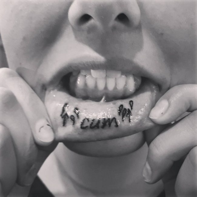 Certains des modèles les plus courants pour les tatouages pour les lèvres, en particulier sur la lèvre intérieure, incluent des mots courts, par exemple: